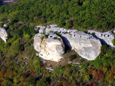 Пещерный город Эски-Кермен насчитывает около 400 пещерных помещений, 50 зерновых ям, 118 кормушек для скота, 2 тарапана и множество хозяйственных сооружений. Кроме того, здесь семь пещерных храмов и руины большой наземной застройки, из которой выделяется здание базилики, заложенной еще в VIII веке, а также несколько раскопанных усадеб. В средние века это было наиболее активное и развитое поселение Края пещерных городов. Предполагается, что около VI века византийцы возвели на плато мощную крепость, продержавшуюся более двух столетий и павшую под натиском хазар. С X столетия город снова восстанавливается, в XIII веке достигает своего наивысшего расцвета и неожиданно погибает, вероятно, в результате нашествия золотоордынского войска Ногая. XIV - XV века в местности отмечены появлением ряда пещерных монастырей и храмов с фресковыми росписями. Один из путей на плато Эски-Кермена лежит через северную калитку – узкий коридор в скале, по которому можно было пройти лишь поодиночке. Оборону здесь в состоянии держать даже небольшой отряд, тем более что с тыла над противником нависала глыба северного дозорного комплекса, откуда было удобно обстреливать весь скальный распадок. На вершину глыбы прорублена широкая лестница. На восточном склоне находится грандиозное гидротехническое сооружение – осадный колодец, второй по масштабности после чуфуткалинского колодца Тик-Кую. Из естественного грота, где был обильный источник, строители пробили сквозь скалу путь на плато. Почти вертикальная лестница из пяти маршей имеет в высоту более 30 метров, у самого выхода вырублена пещера для охранников колодца. Еще один пешеходный путь на плато проходит через восточную калитку. В скальном склоне вырублены ступеньки и уступы для удобства подъема, а у самого выхода снова необходимо пройти через узкий коридор, над которым нависают скальные глыбы с площадками для защитников. А для телег и повозок с южной стороны был устроен колесный путь, ведущий тремя маршами к главному входу в город. Проехав контрольный пункт (выступ на дороге, через который перебрасывали мостки), путник попадал на главную улицу города, протянувшуюся до самой середины плато к главному храму – базилике. С обеих сторон улицу обступали вначале пещерные, а затем наземные постройки. Сегодня на месте наземных зданий лишь холмики земли, кустарники и редкие россыпи камней. Наиболее известный из пещерных храмов Эски-Кермена Судилище является результатом более позднего объединения нескольких пещер. Здесь можно выделить некрополь, крещальню с каменной купелью, треснувшей по линии раскола скалы, алтарь и восточную часовню. Небольшой храм в придорожных глыбах носит название Трех всадников по сюжету фрески, изображающей трех человек с нимбами, скачущих на лошадях. Фреску датируют XII - XIII веками. Еще один храм с фреской – церковь Успения. Его апсида вырублена в помещении, носившем явно хозяйственное назначение LXVII. Здесь имеется большая яма, ссыпное отверстие в потолке и редкий для Эски-Кермена тарапан. На западном склоне представлено обилие самых разнообразных пещерных помещений, часто объединенных в большие блоки. Выступающие в долины скальные глыбы с неповторимыми формами также использовались человеком для устройства внутрискальных помещений и сооружений.